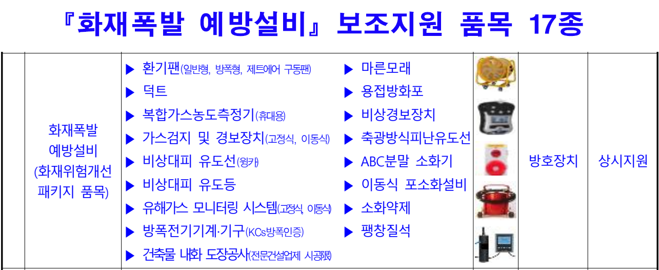 화재 폭발 예방설비 품목 / 화재위험개선 패키지 재정지원 신청방법